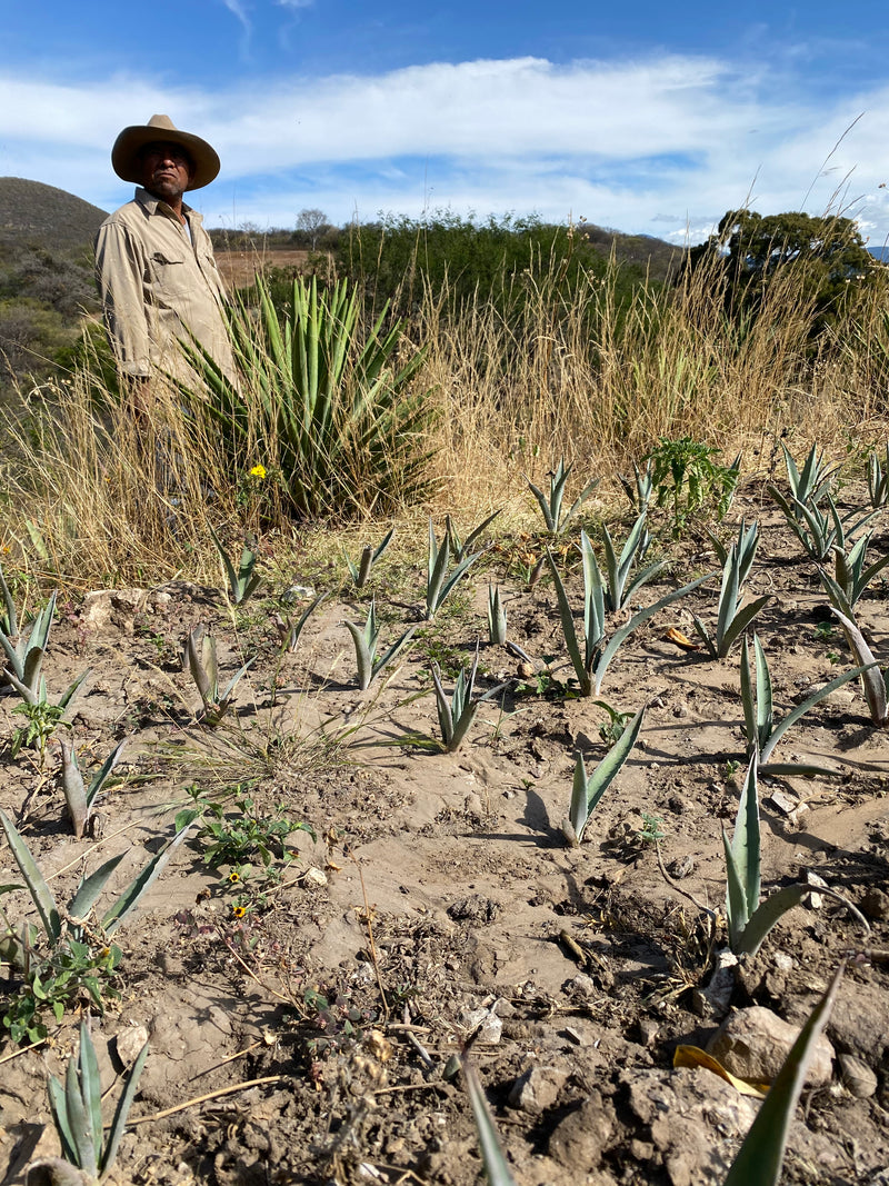 Nicolas at the agave nursery, including Tobala